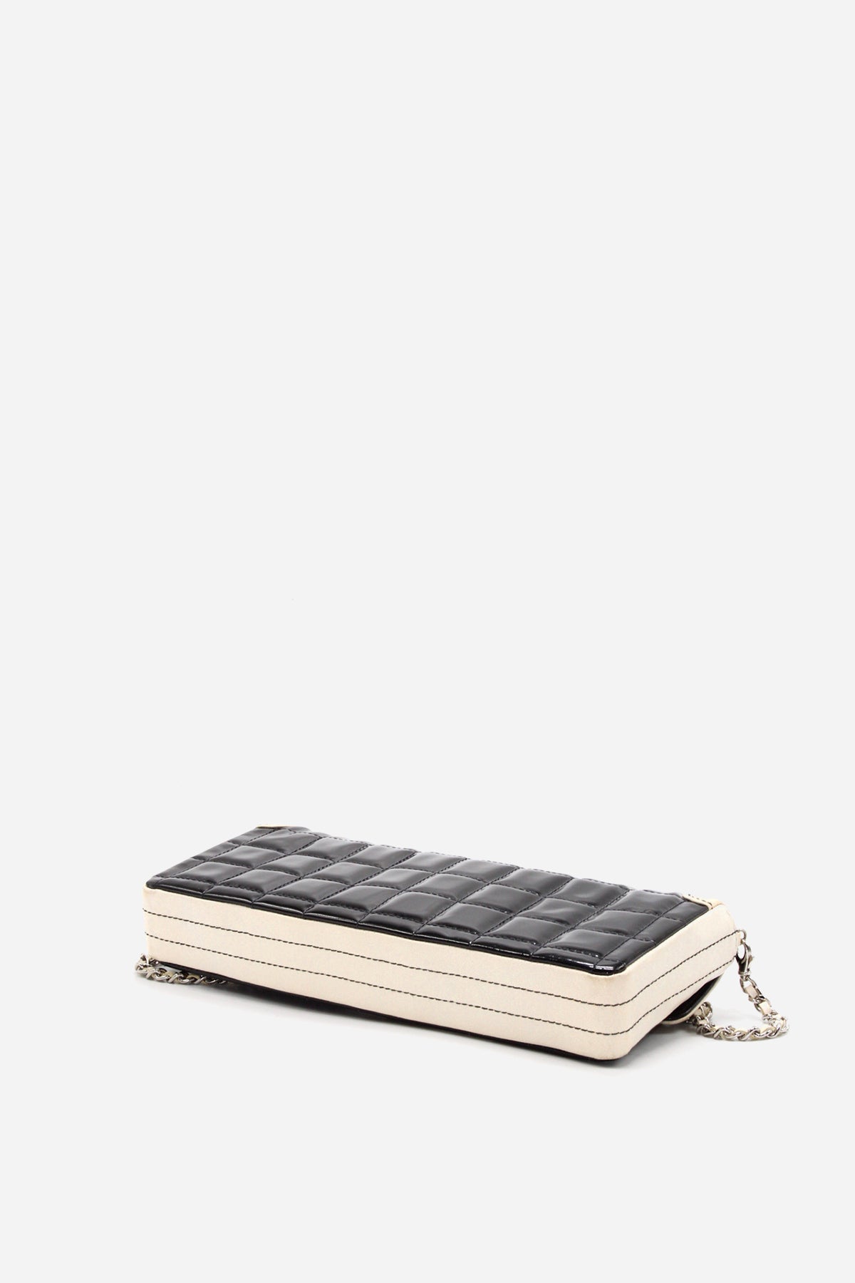 Experience luxury and elegance with the Chanel Vintage Chocolate Bar E/W Flap Bag. Designed by Karl Lagerfeld, this black patent Lambskin shoulder bag features an interlocking CC logo, quilted pattern, and chain-link accent, all adorned with silver-tone hardware and white leather trim. The chain-link shoulder strap and leather lining provide comfort and practicality, while the turn-lock closure at the front adds a touch of sophistication. Elevate your style with this timeless and iconic piece.