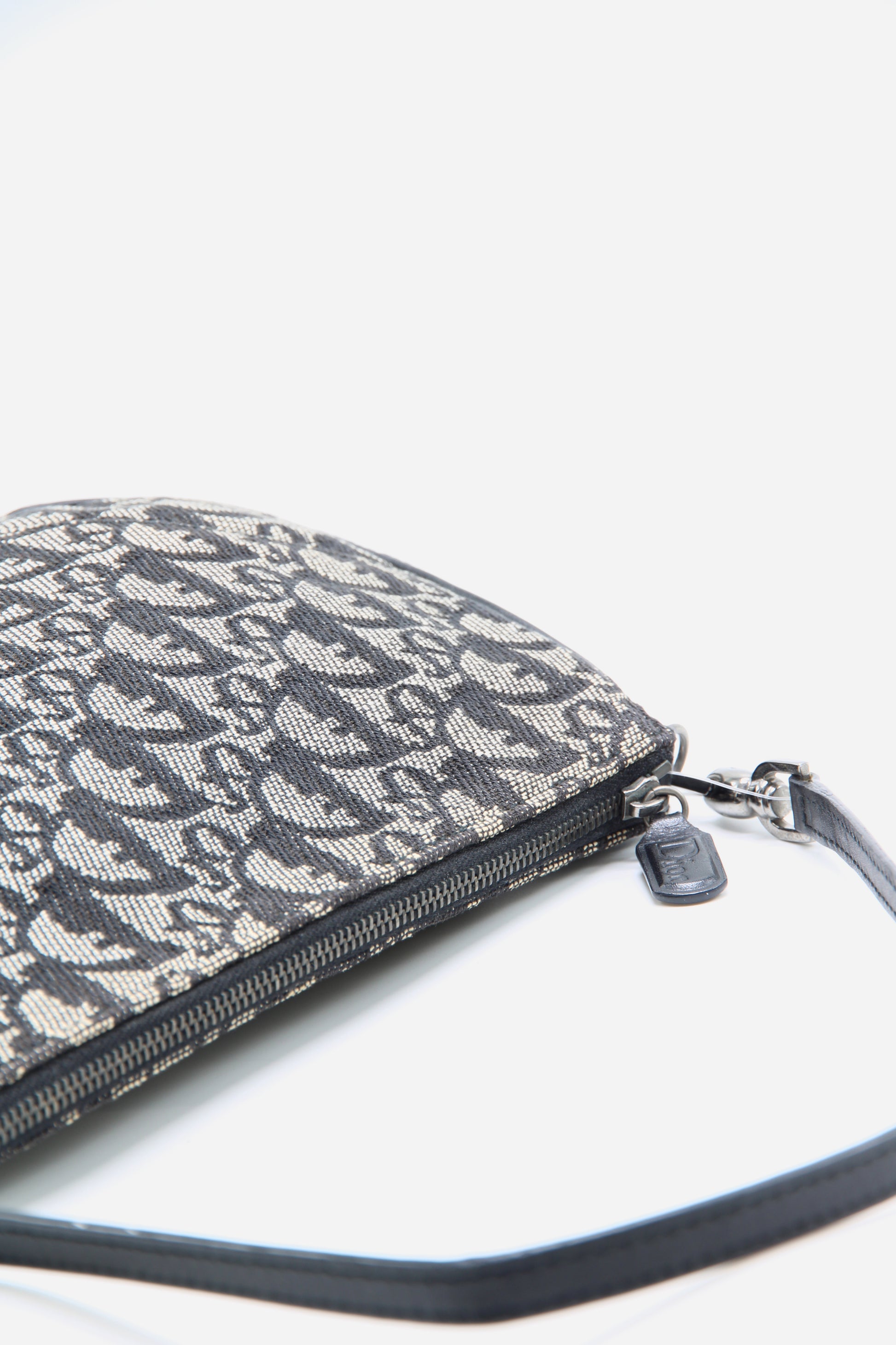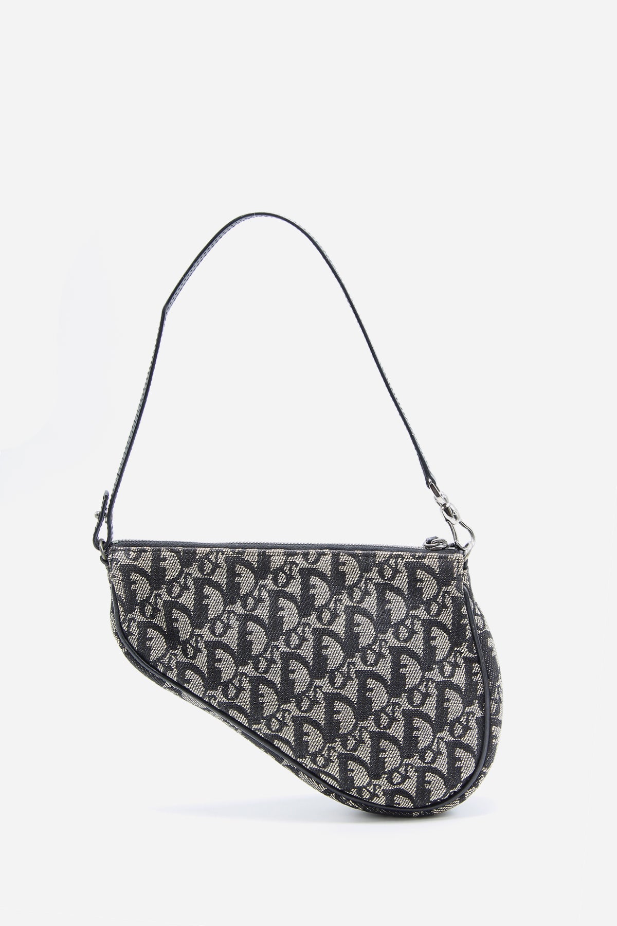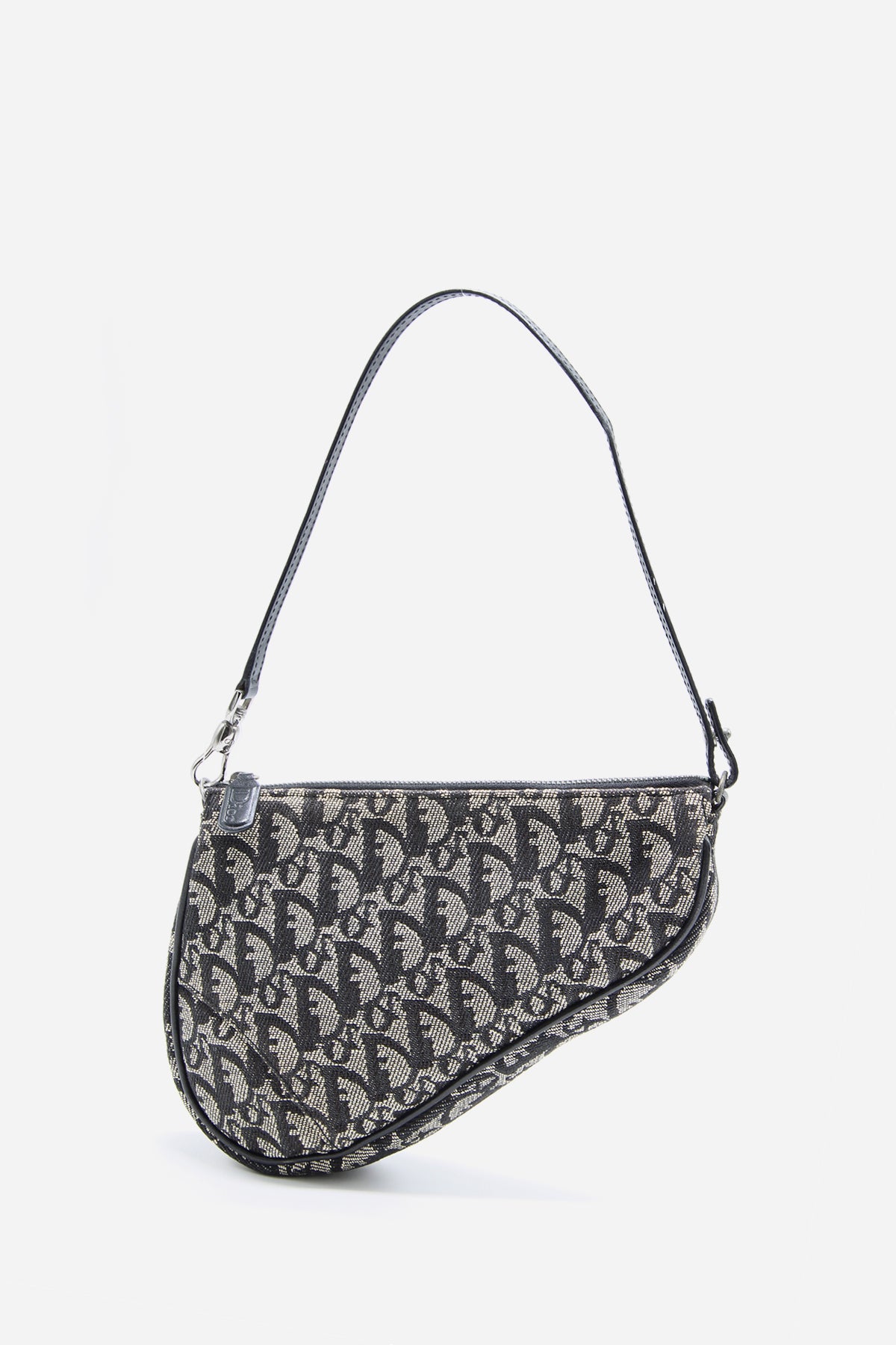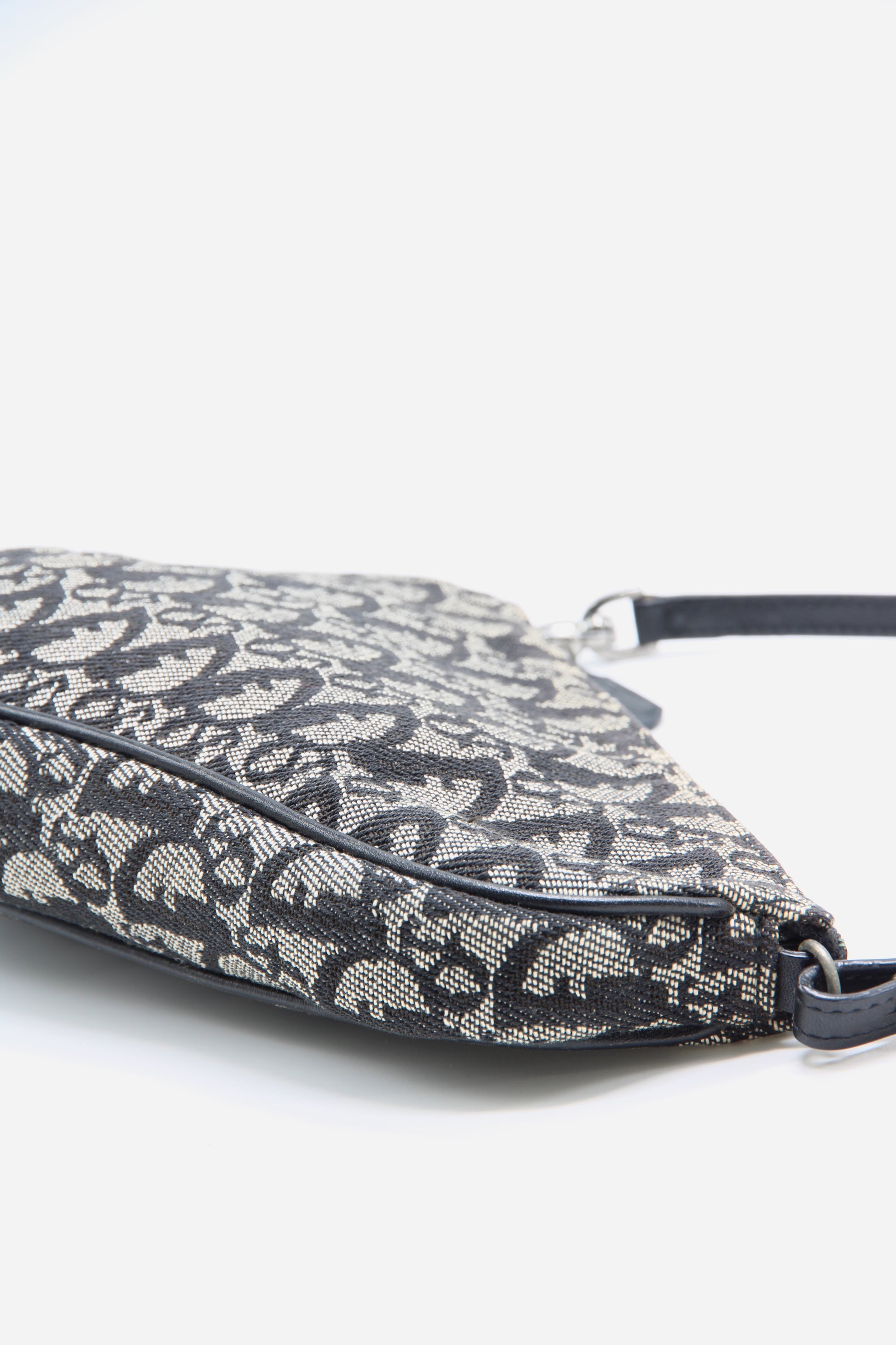 This Vintage Diorissimo Saddle Pochette from Christian Dior's 2004 Collection by John Galliano. Crafted from black canvas with a signature Diorissimo pattern, this bag features gunmetal hardware and a single shoulder strap. Finished with leather trim detailing and a zip closure.